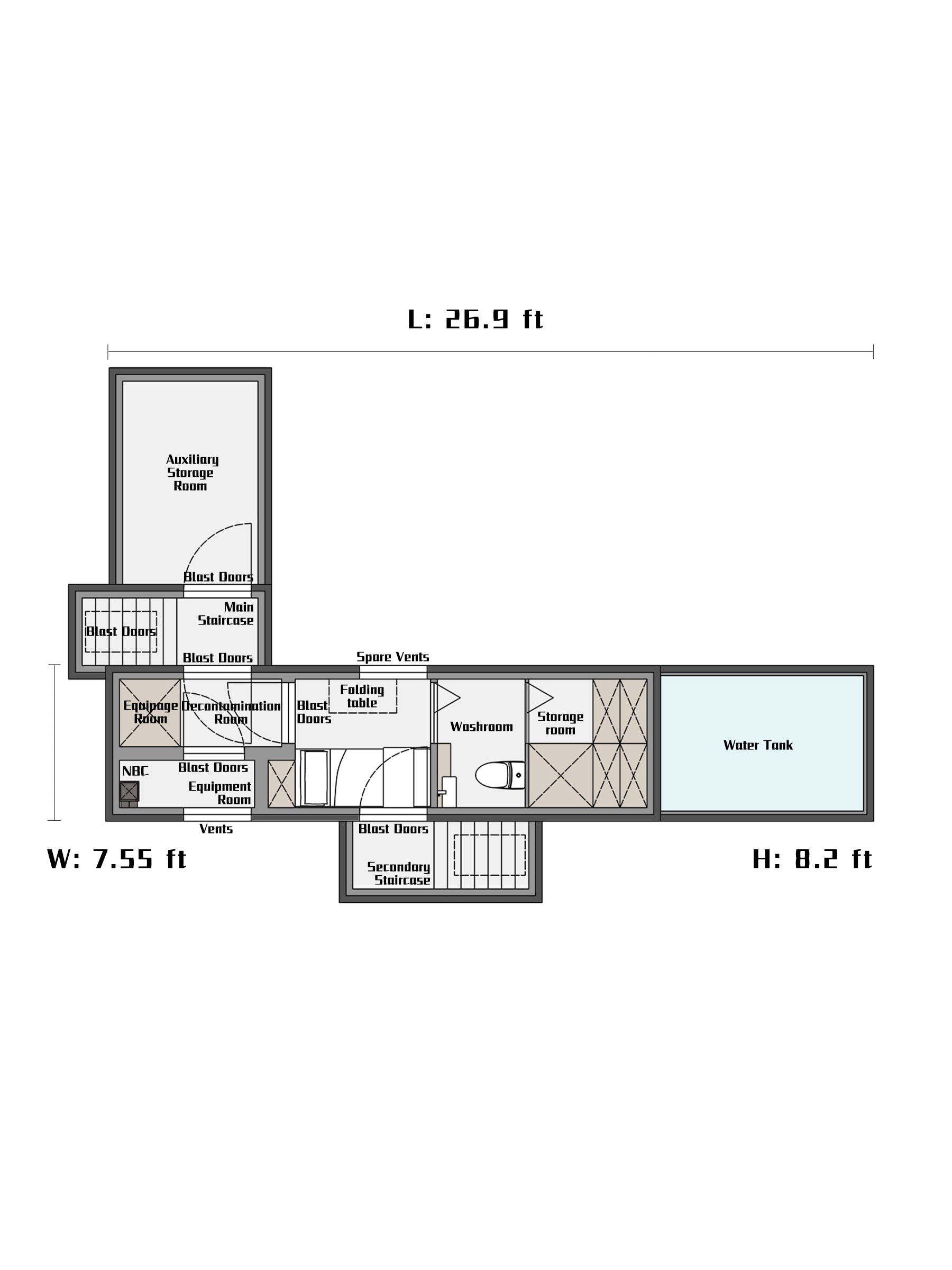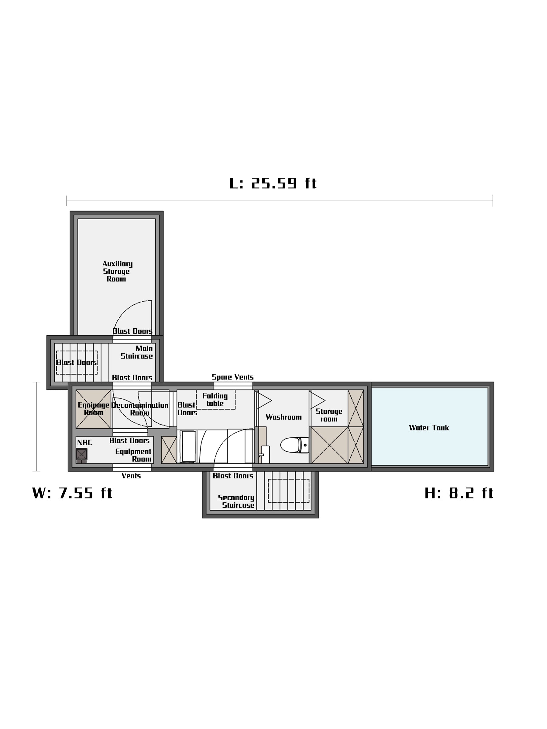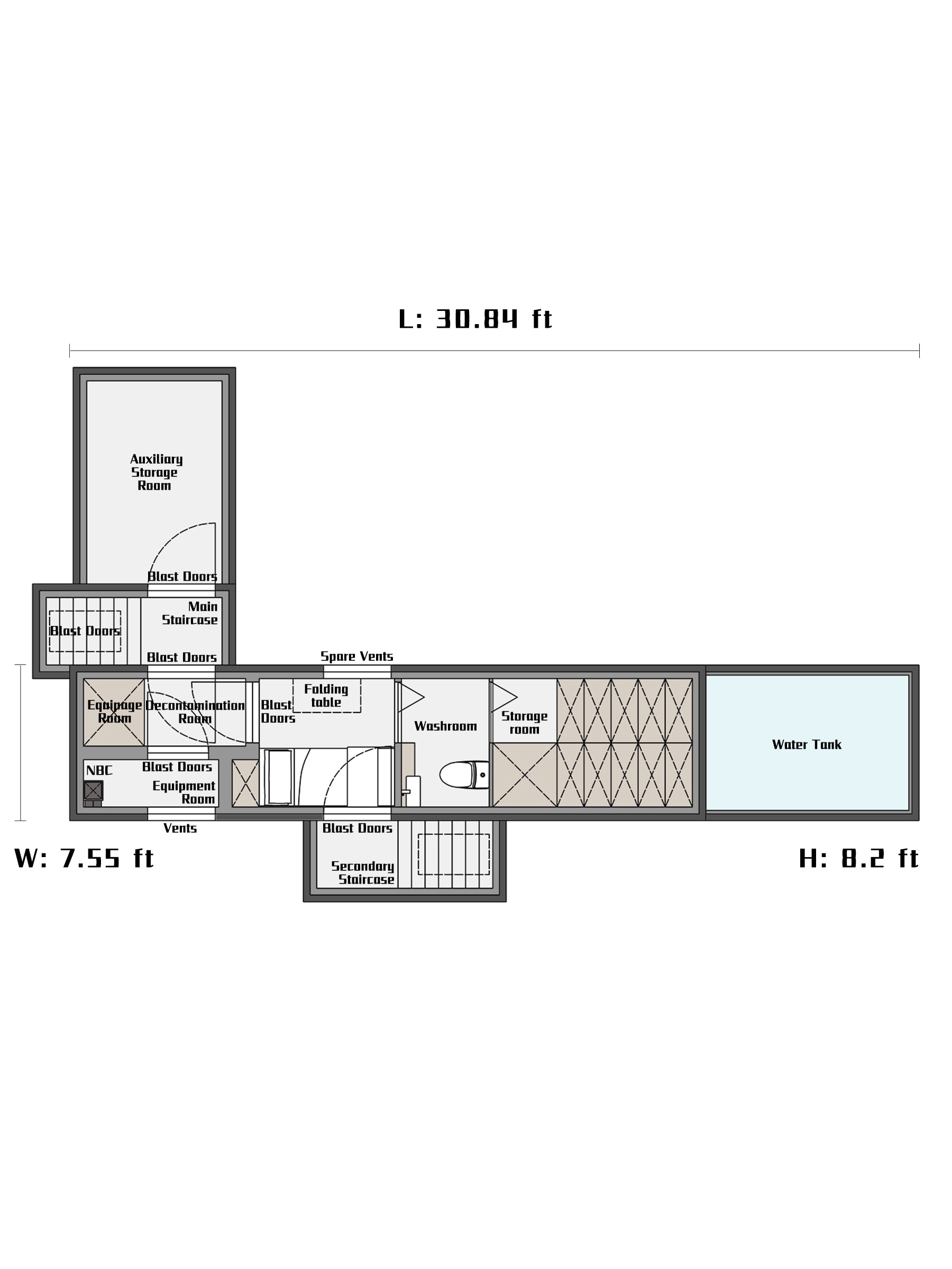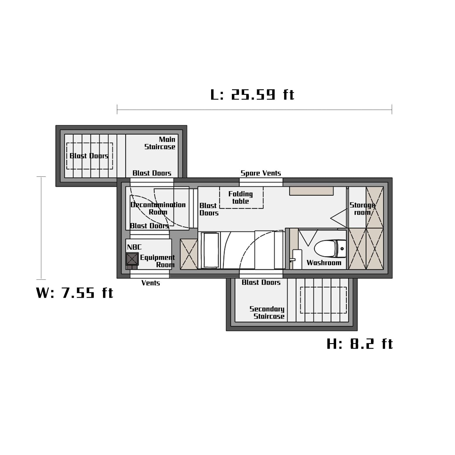 Any design that puts the generator inside the bunker is irresponsible! Because there is an explosion risk in the power generation process and the storage of fuel, the generator room in the bunker must be set up separately, and the door of the generator room must also be an blast door. It is also recommended to use blast doors for the front and back doors of the main staircase and secondary staircase.
