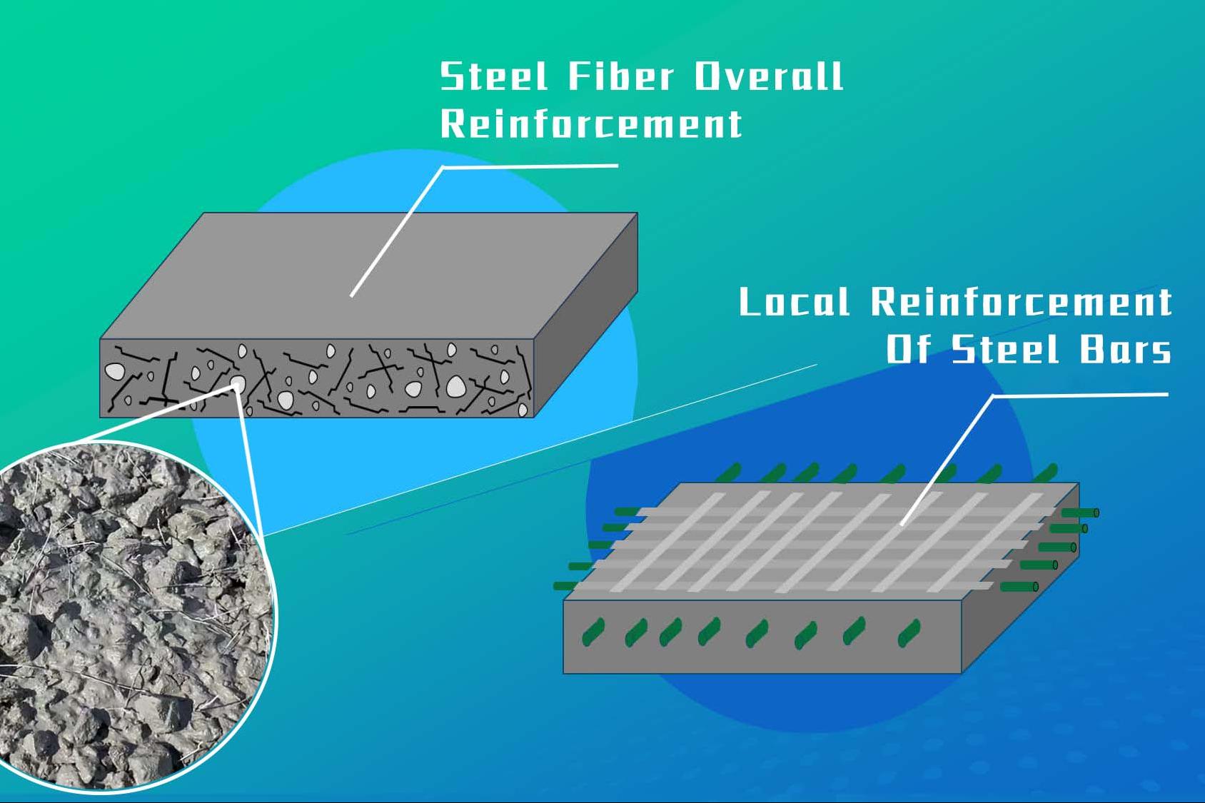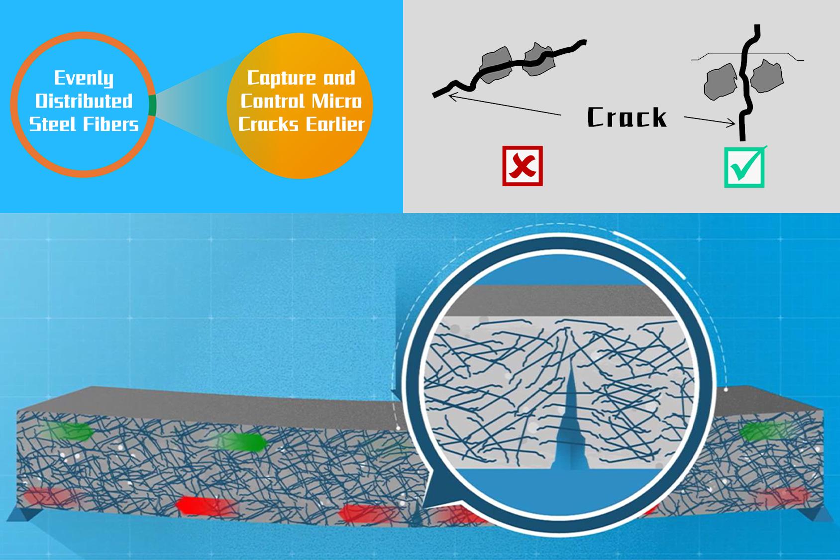Steel fibers interact with each other in concrete, taking on tensile stress at any point and in any direction. It captures micro cracks earlier than traditional steel bars and acts as a bridge, thus hindering the development and deterioration of cracks.